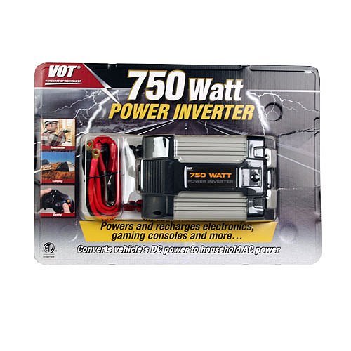 Vot Power Inverters convert your vehicle's DC power into AC "wall" current to power your gear. SAVE BIG! Get power to go! Just because you're on the road doesn't mean you have to leave the necessities behind. Vot Inverters pull direct-current power directly from your vehicle's electrical system and convert it to AC current. Provides continuous-draw power, so you can do everything from charge cell phones, cameras and music players to power small appliances. Turn the juice loose: Easy connection with universal cabling; Several power ratings available to suit a variety of uses; High-surge capacity; AC and USB power outlets; Built-in protection for low / high voltage, temperature, short circuit and overload; LED power indicator; Runs work lights, small appliances, TVs, gaming systems, etc.; Includes .6m cables, USB port. 3 lbs., 10 ozs. Save big! Order Today! Vot 750W Power Inverter
